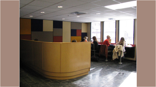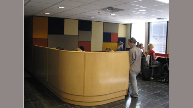 A poorly used building lobby was transformed into this espresso bar and café. The resulting café has become a popular place for student and faculty interaction. Pelsue Architecture designed a fun, attractive retail space within the constraints of the existing building and budget. The area is at a crossroads within the large science building, requiring that exits be maintained within the renovation. Fixed seating defines the seating area and maintains the exits for the building. Colorful sound absorbing panels were designed to diminish the noise and introduce a playful color element within the building. The underutilized lobby area is now a busy seating area for the café.